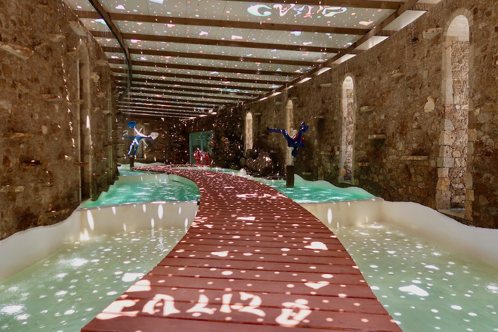 - Every design element at Calilo is created by its owner Angelos Michalopoulos and aimed at stirring emotions among its guests. The result is an aesthetically unique and fairy tale-esque decor that represents a modern, colorful take on traditional Cycladic architecture and the hippy culture that once dominated Ios. The decor is at its most surreal in the lobby, which it accessed via a curving walkway lined by art works and waterfalls. Skylight beaming through pebble holes in the ceiling above disperses as dozens of hearts on a water pond beneath. Decorated with hand-painted army boots, inspirational aphorisms, and wooden swings dressed in flowers, the lobby feels more like an art gallery in London or New York than a hotel in the Greek islands.