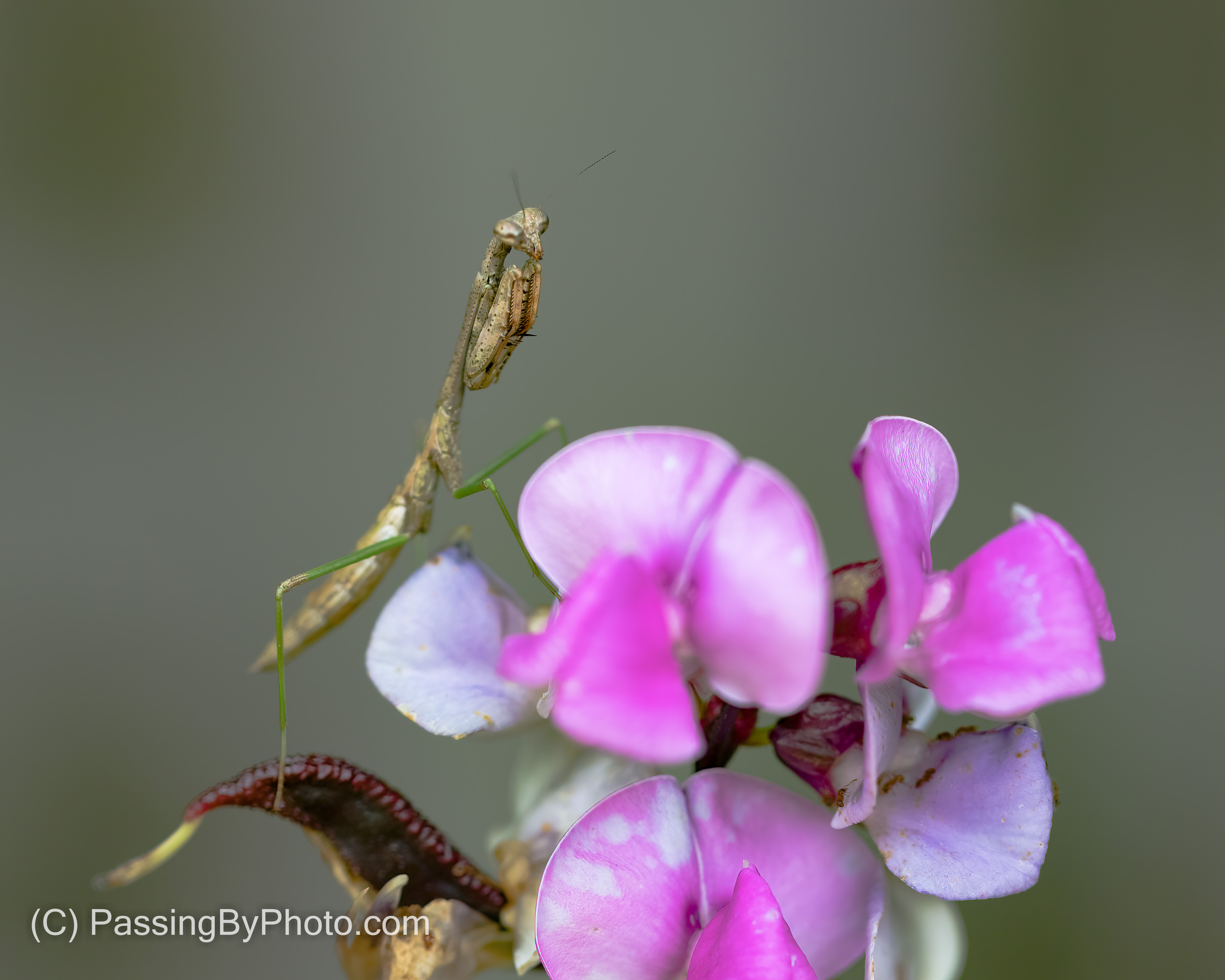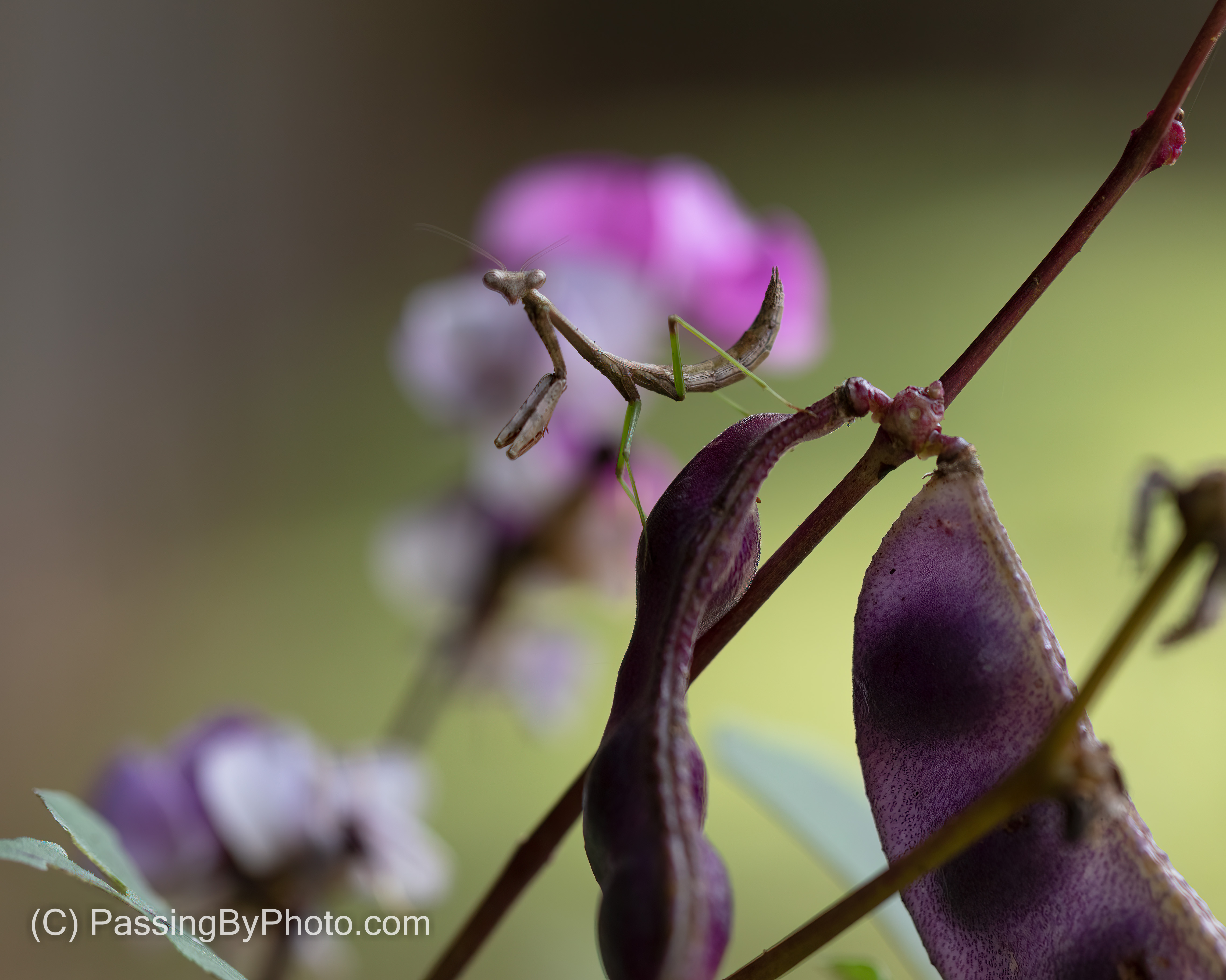 Ellen Jennings posted: "This Praying Mantis has been hanging out in the corner of our back yard. The first time I spotted him he disappeared while I retrieved my camera. A few days later I got another chance when I found him nicely posed on a newly opened Hyacinth Bean fl"